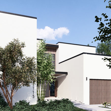 Minimalist Massing: The home likely features clean, rectilinear volumes with a restrained material palette—concrete, stucco, and glass—used to create a calm and timeless aesthetic.